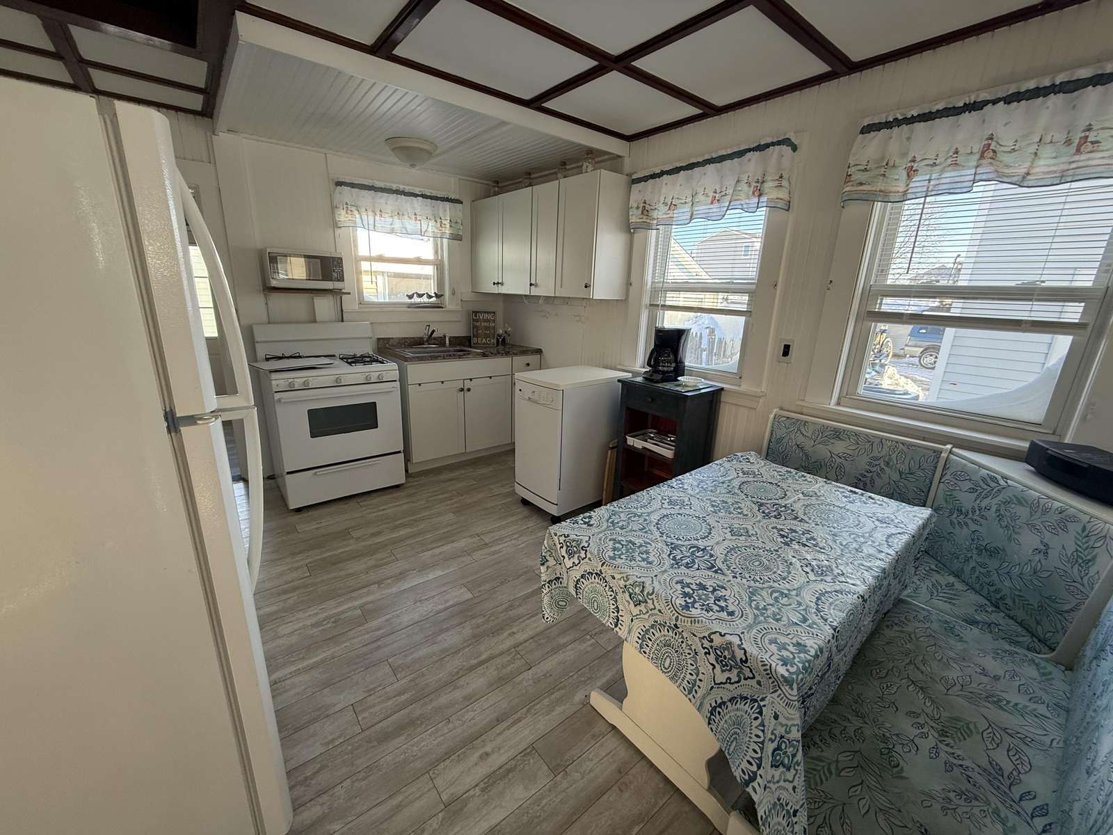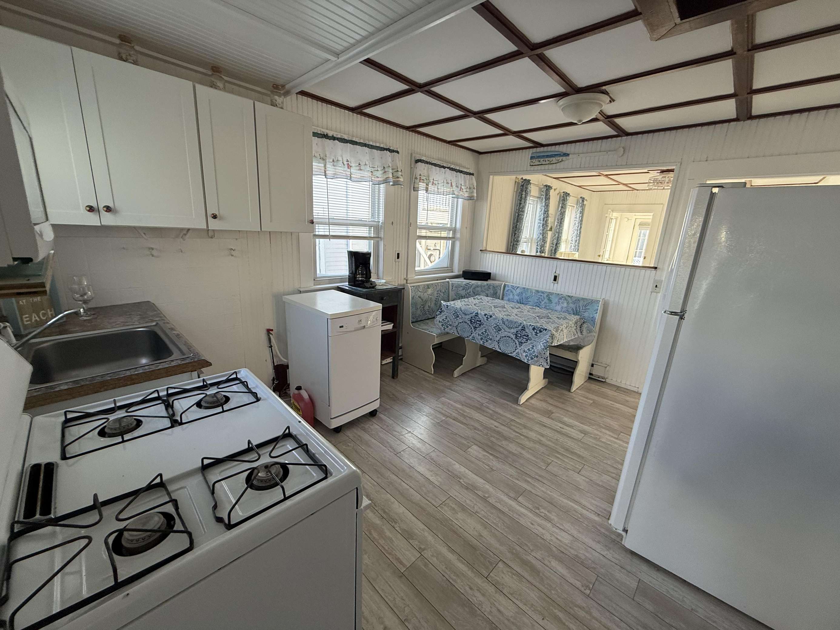 Charming 3-bedroom, 1-bath retreat just steps from Hampton Beach. This cozy front unit offers modern comforts including four window air conditioners, WiFi, and a fully equipped kitchen with coffee maker, microwave, and range. Relax on the private enclosed porch or unwind in the living room with a cable TV. The cottage features convenient amenities like a washer and dryer, dining area, and a short walk to the beach. Bedrooms offer a queen, full and full as well as a twin day bed with trundle in the living room. 2 car parking in tandem in the left side driveway. Just a quick walk from restaurants, entertainment and shopping.