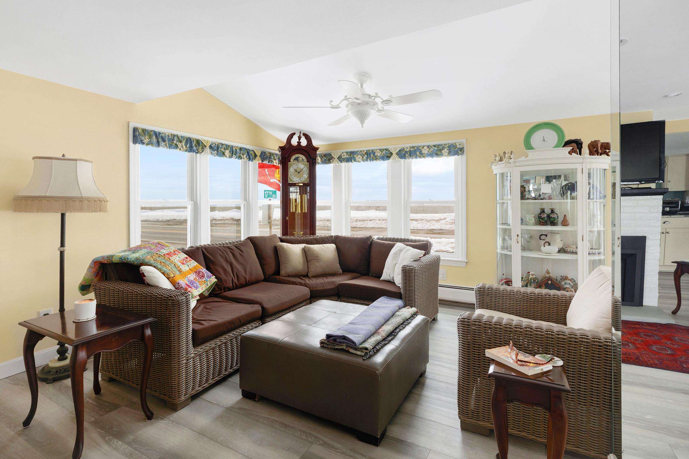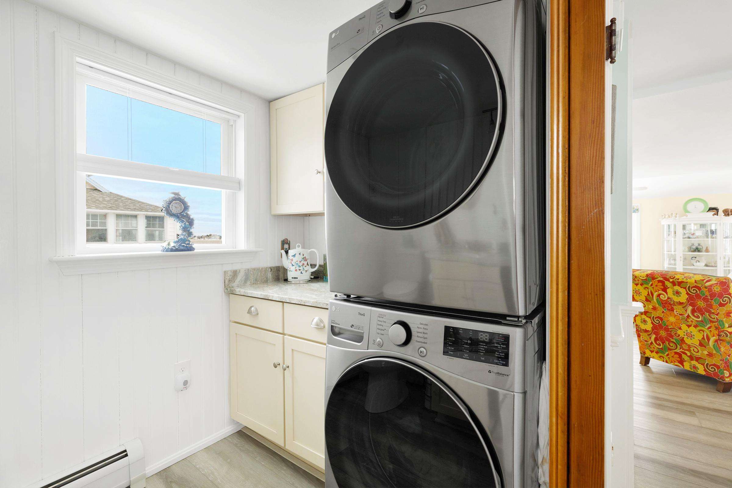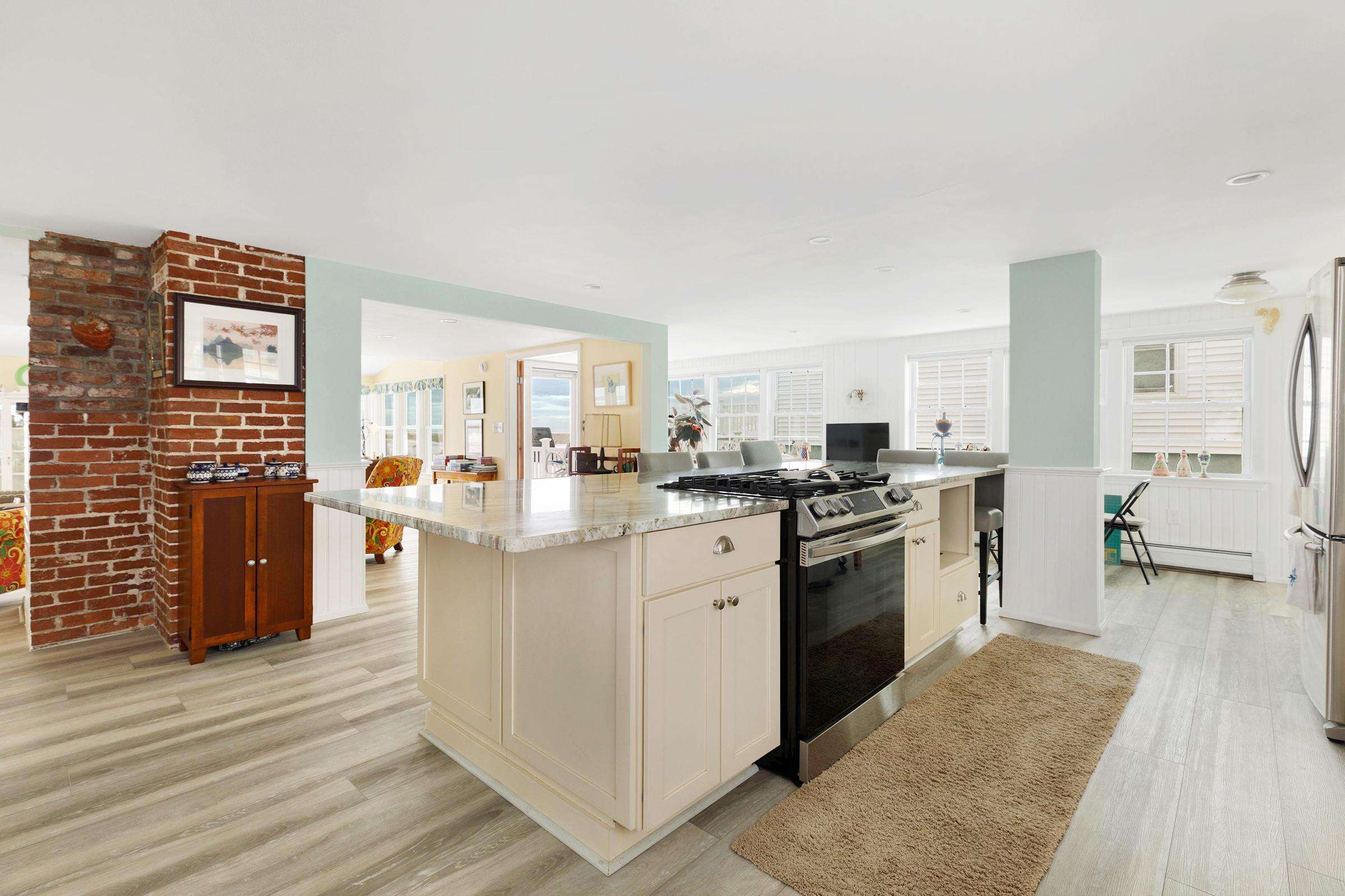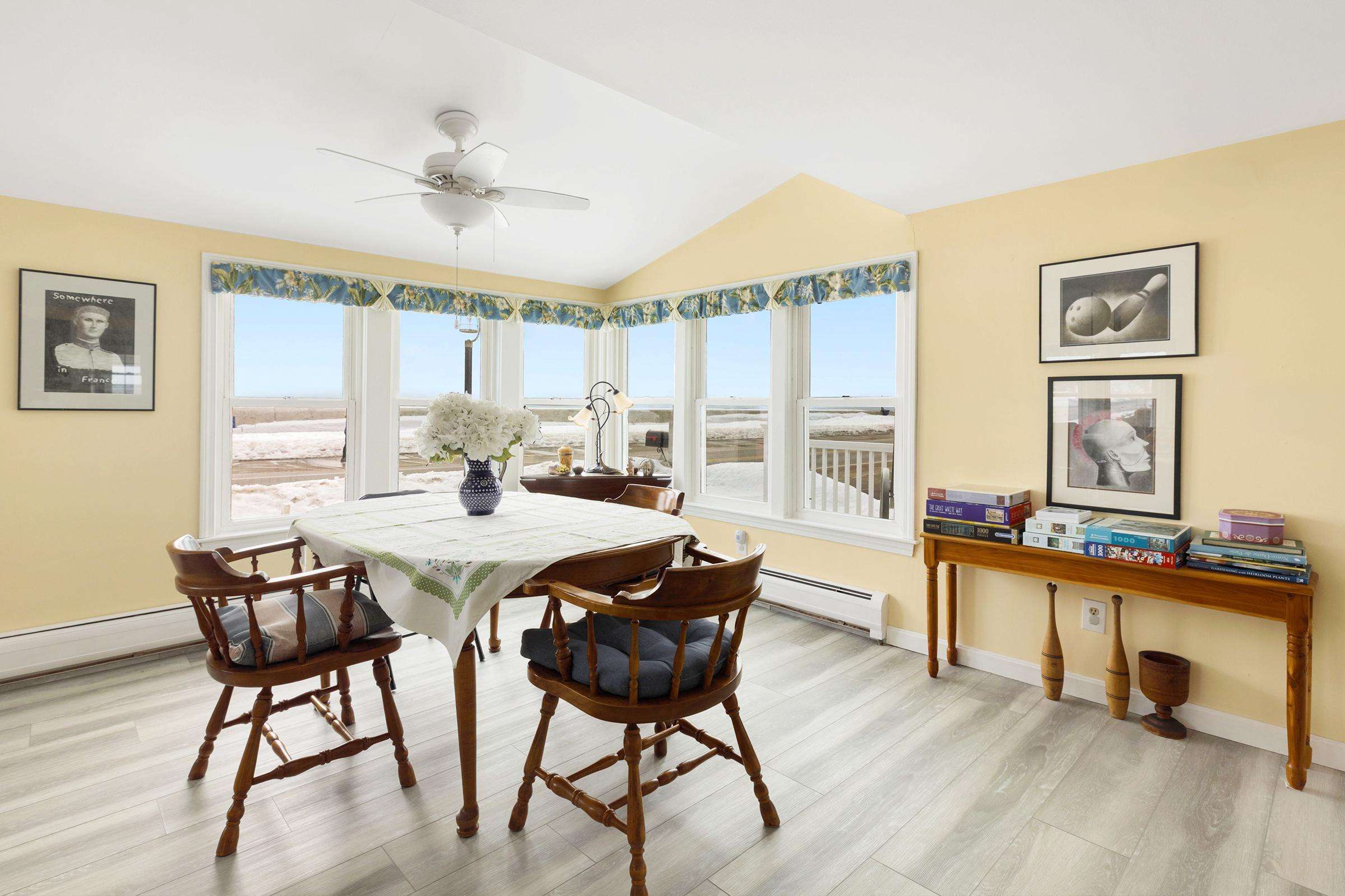 Experience the best of Hampton’s North Beach in this charming two-bedroom, 1.5-bath home situated on a prime corner lot. The moment you step inside, you are greeted by stunning ocean views through an abundance of windows that flood the open-concept first floor with natural light. The spacious kitchen is a chef's delight, featuring a full suite of stainless steel appliances, ample counter space, and a large breakfast bar island perfect for morning coffee. This level also provides a comfortable living and dining area, a television for entertainment, and a convenient half bath equipped with a washer and dryer. A window air conditioner keeps this main gathering space cool, while the large enclosed porch offers a perfect spot to relax.