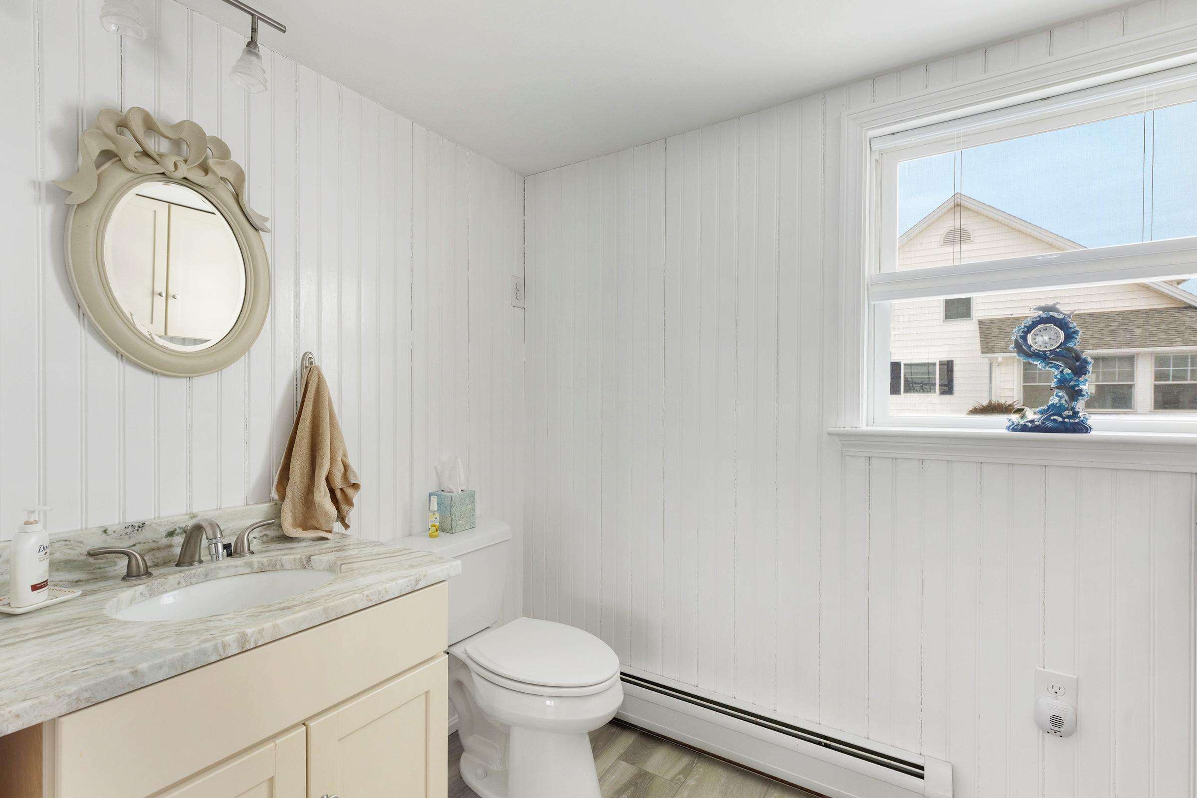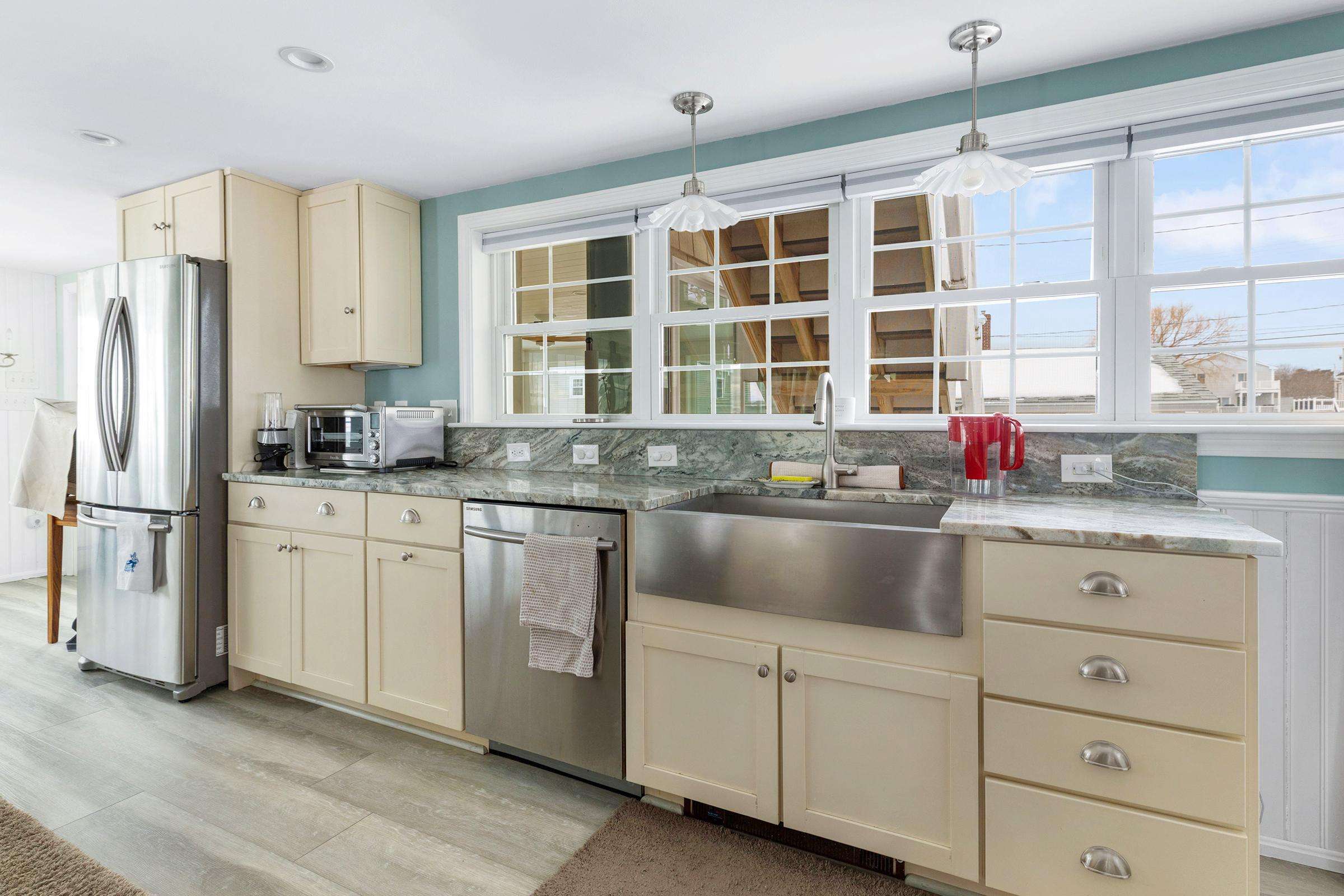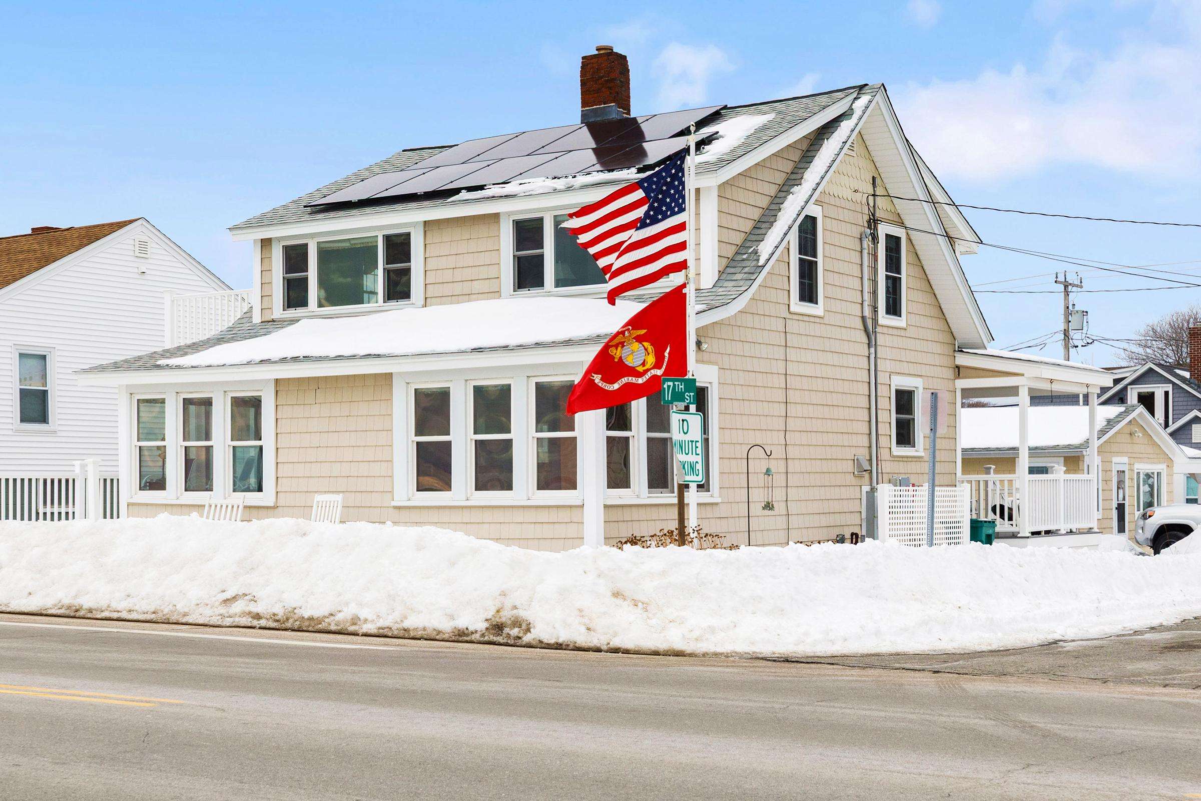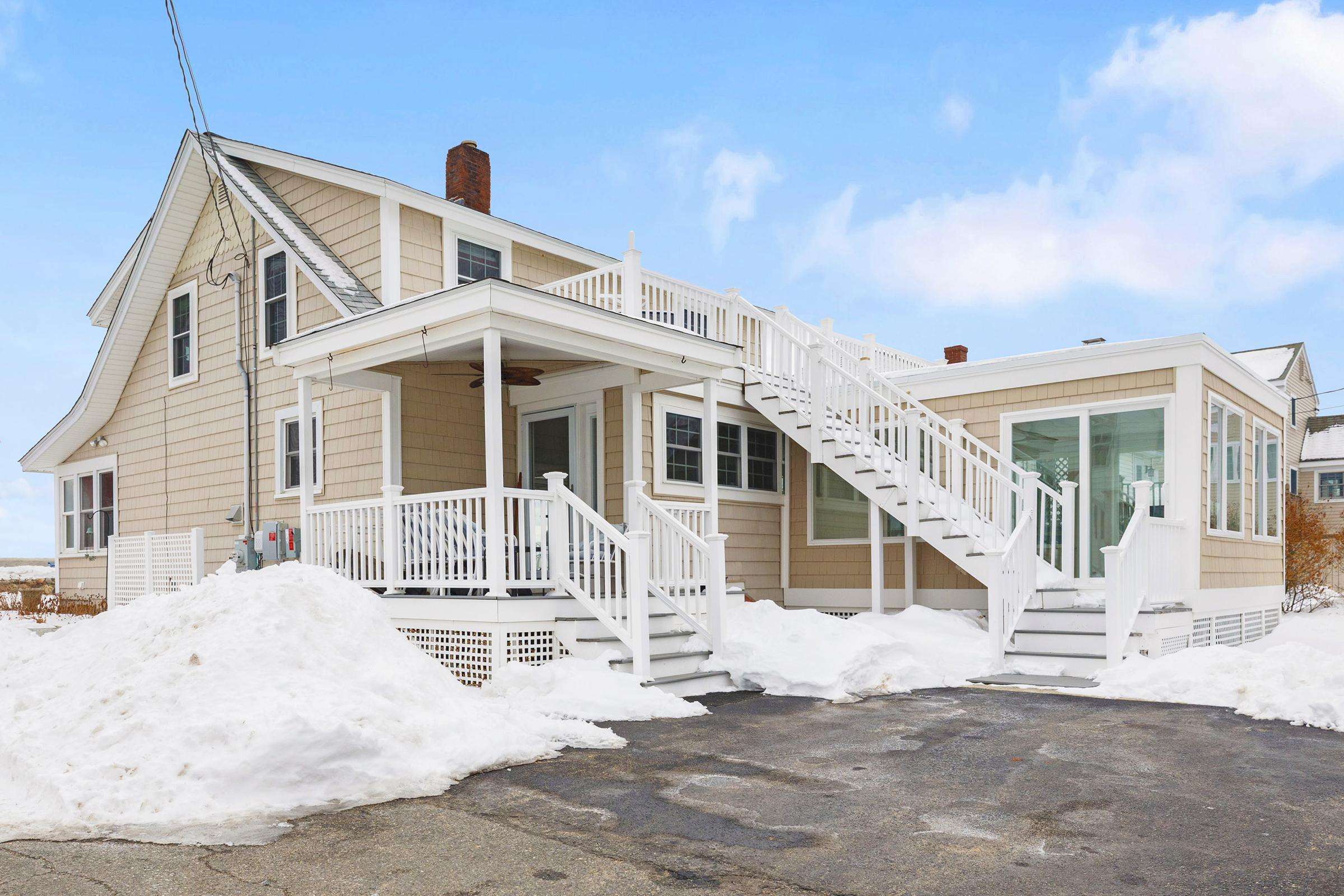 Experience the best of Hampton’s North Beach in this charming two-bedroom, 1.5-bath home situated on a prime corner lot. The moment you step inside, you are greeted by stunning ocean views through an abundance of windows that flood the open-concept first floor with natural light. The spacious kitchen is a chef's delight, featuring a full suite of stainless steel appliances, ample counter space, and a large breakfast bar island perfect for morning coffee. This level also provides a comfortable living and dining area, a television for entertainment, and a convenient half bath equipped with a washer and dryer. A window air conditioner keeps this main gathering space cool, while the large enclosed porch offers a perfect spot to relax.