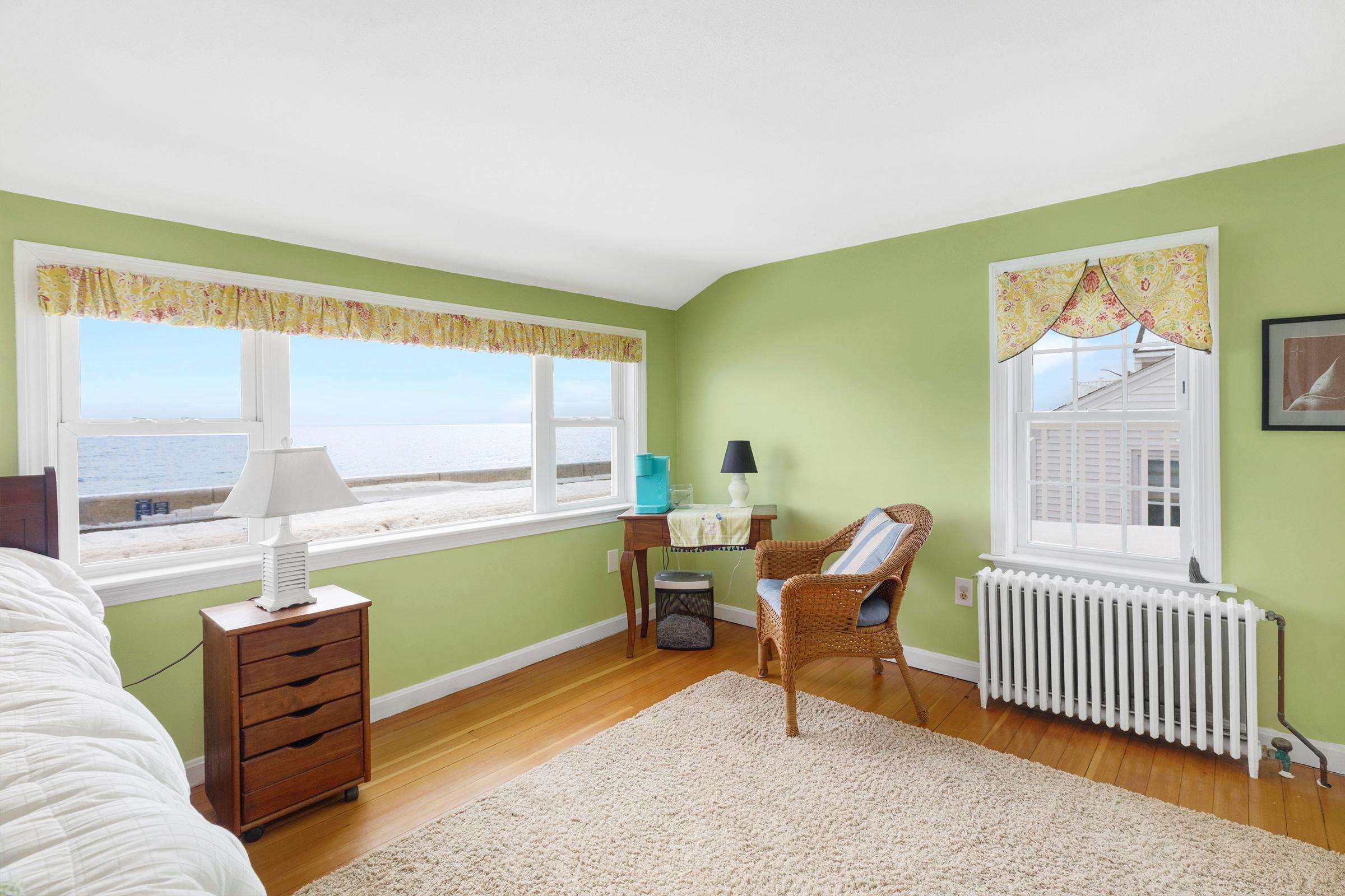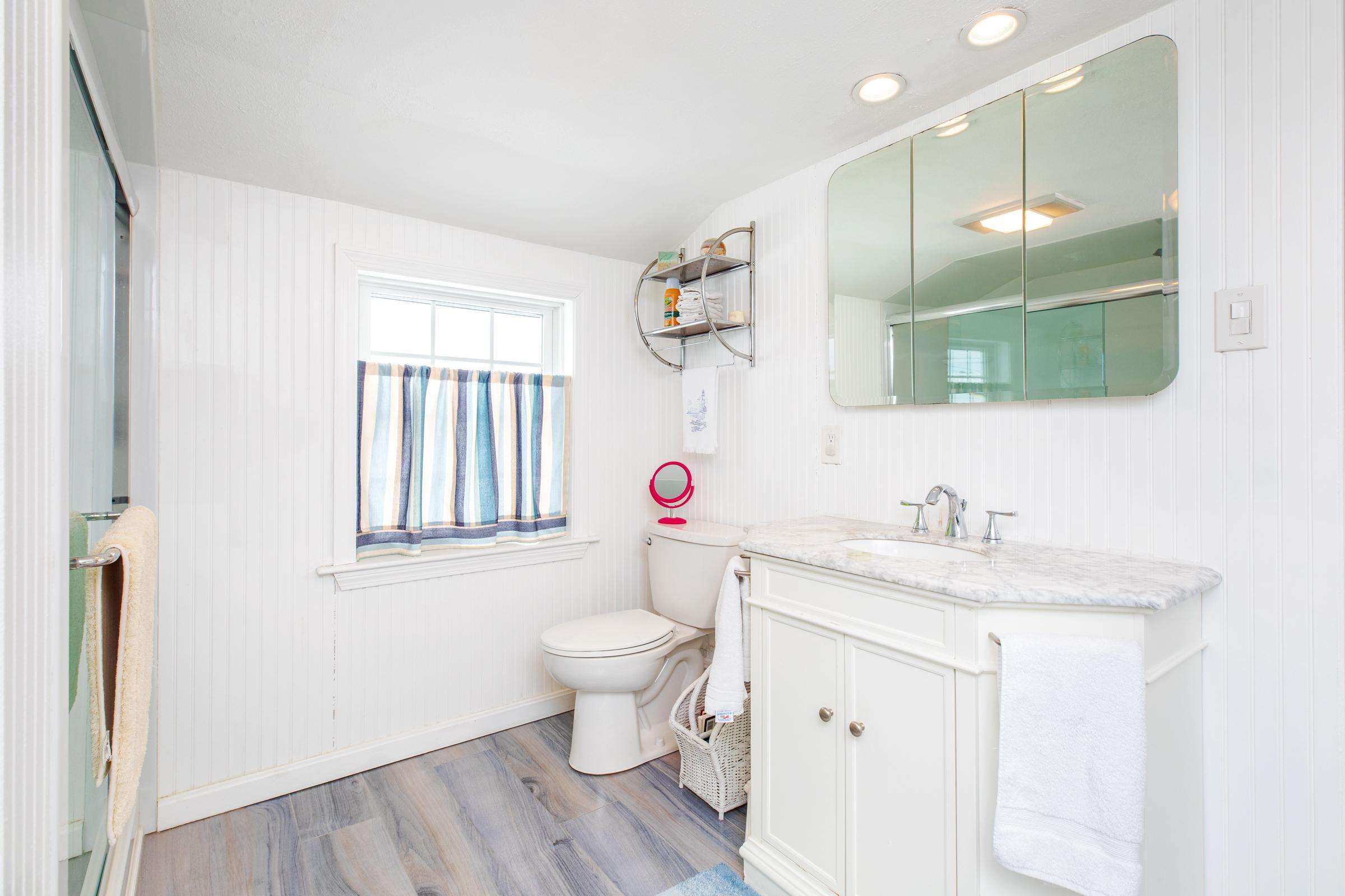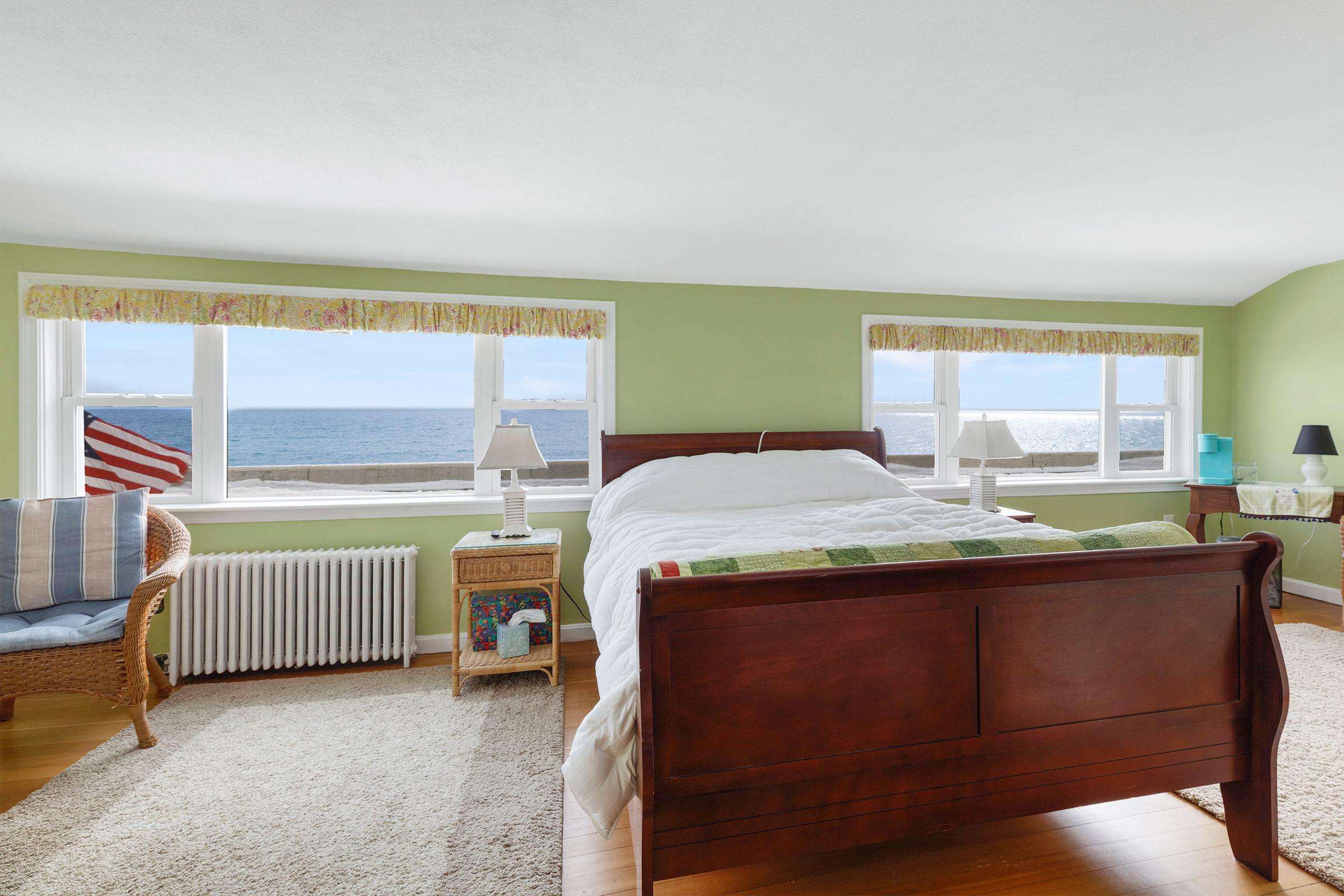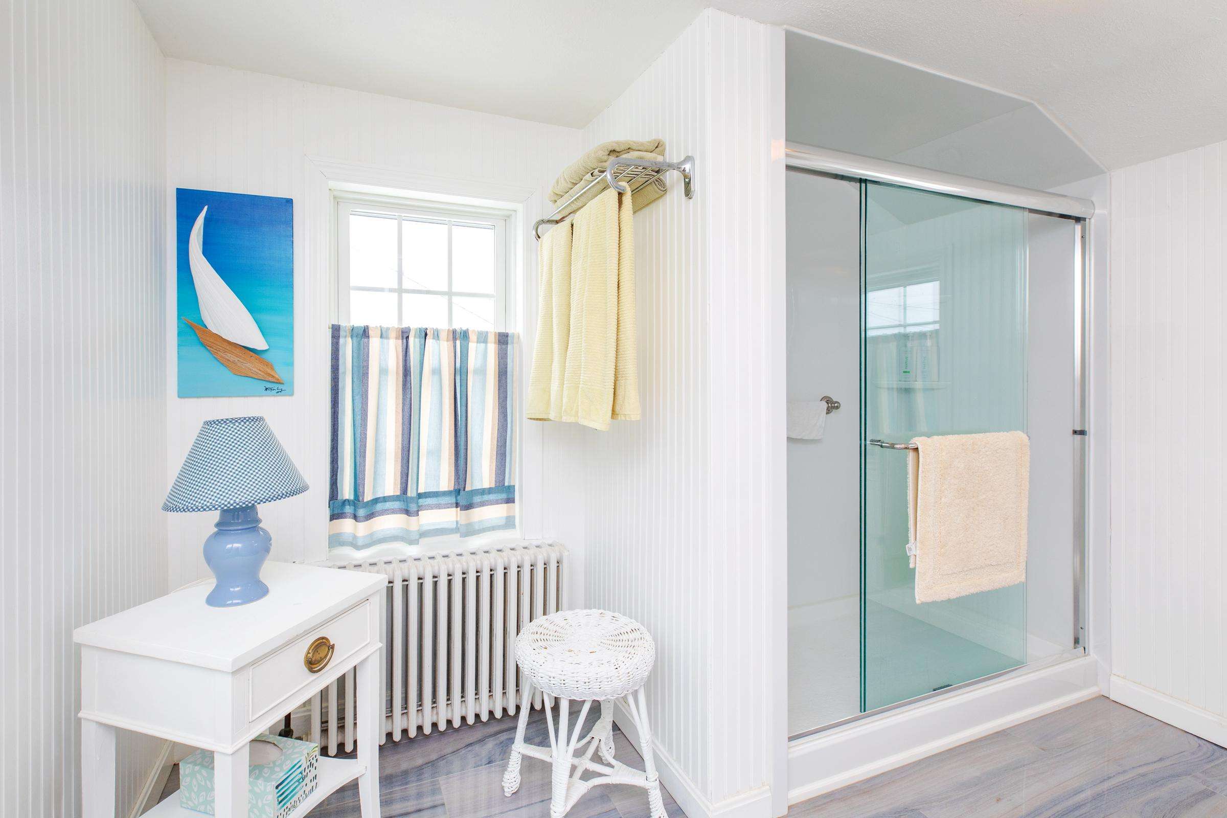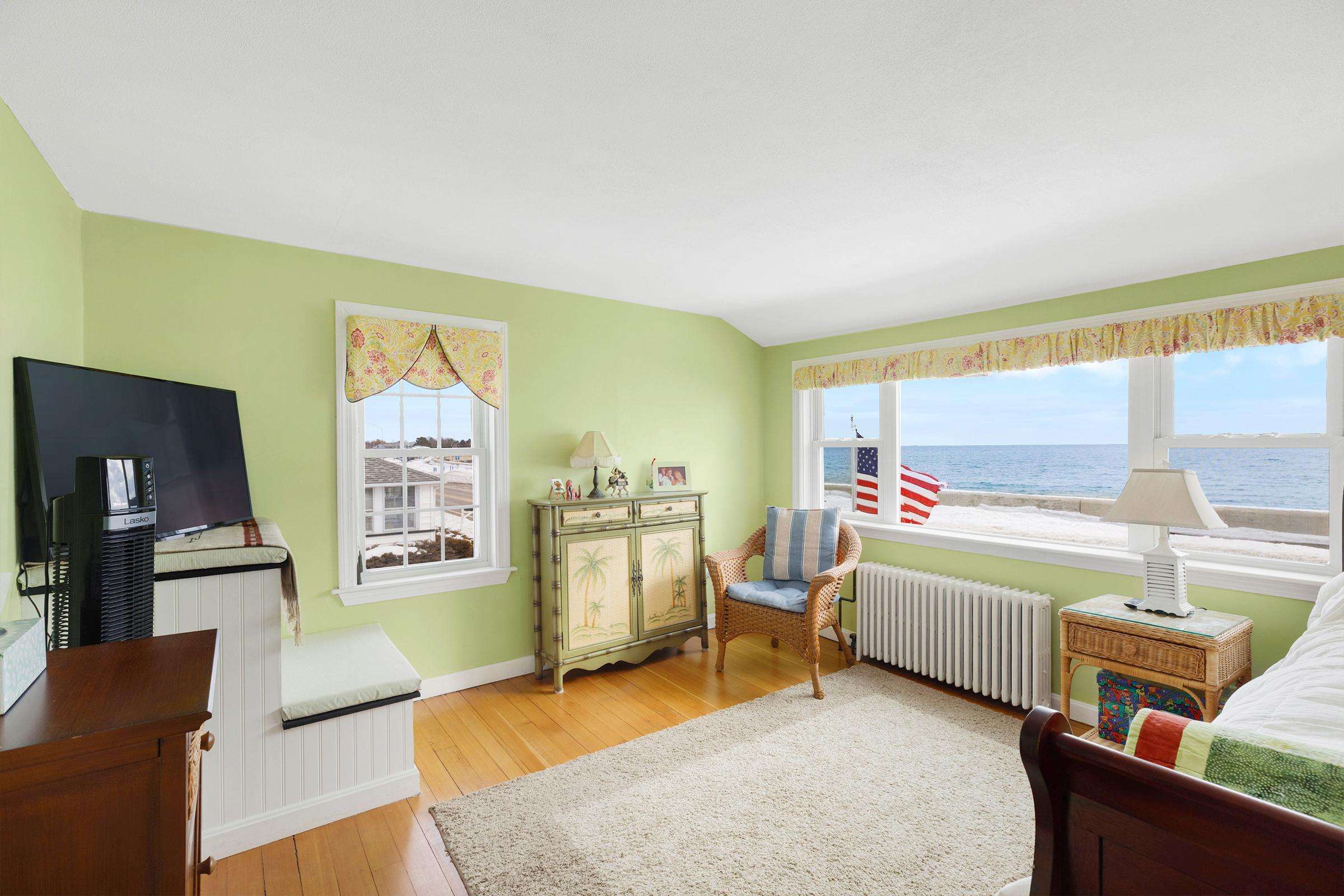 Experience the best of Hampton’s North Beach in this charming two-bedroom, 1.5-bath home situated on a prime corner lot. The moment you step inside, you are greeted by stunning ocean views through an abundance of windows that flood the open-concept first floor with natural light. The spacious kitchen is a chef's delight, featuring a full suite of stainless steel appliances, ample counter space, and a large breakfast bar island perfect for morning coffee. This level also provides a comfortable living and dining area, a television for entertainment, and a convenient half bath equipped with a washer and dryer. A window air conditioner keeps this main gathering space cool, while the large enclosed porch offers a perfect spot to relax.