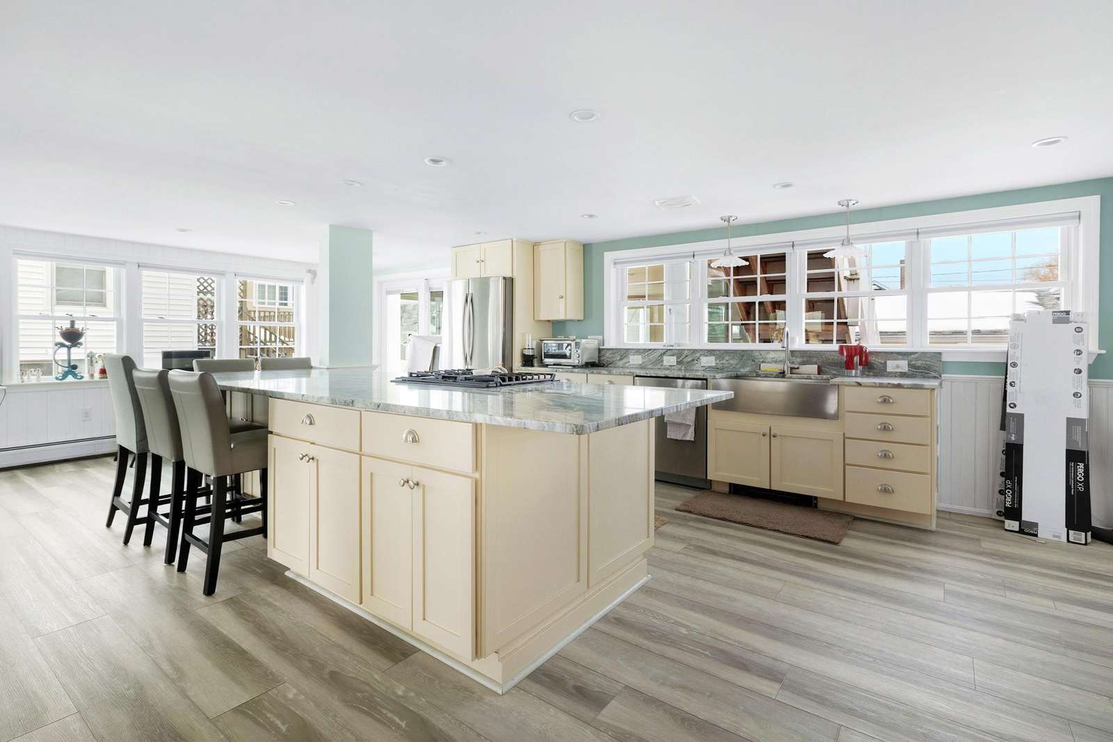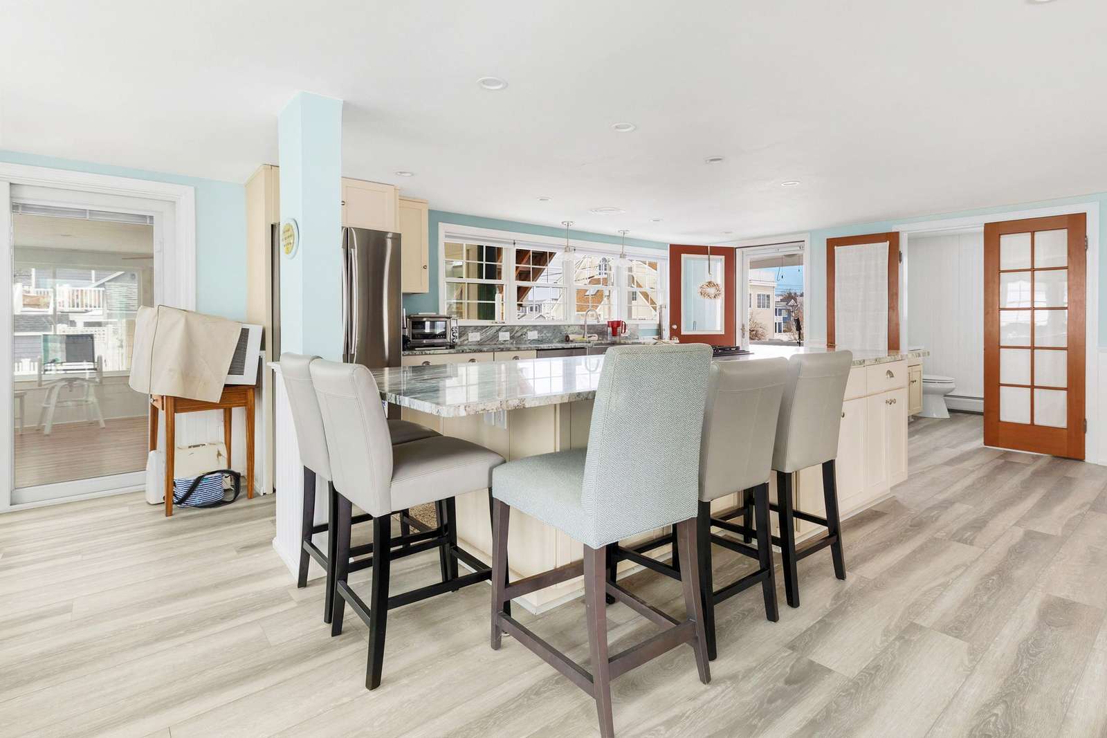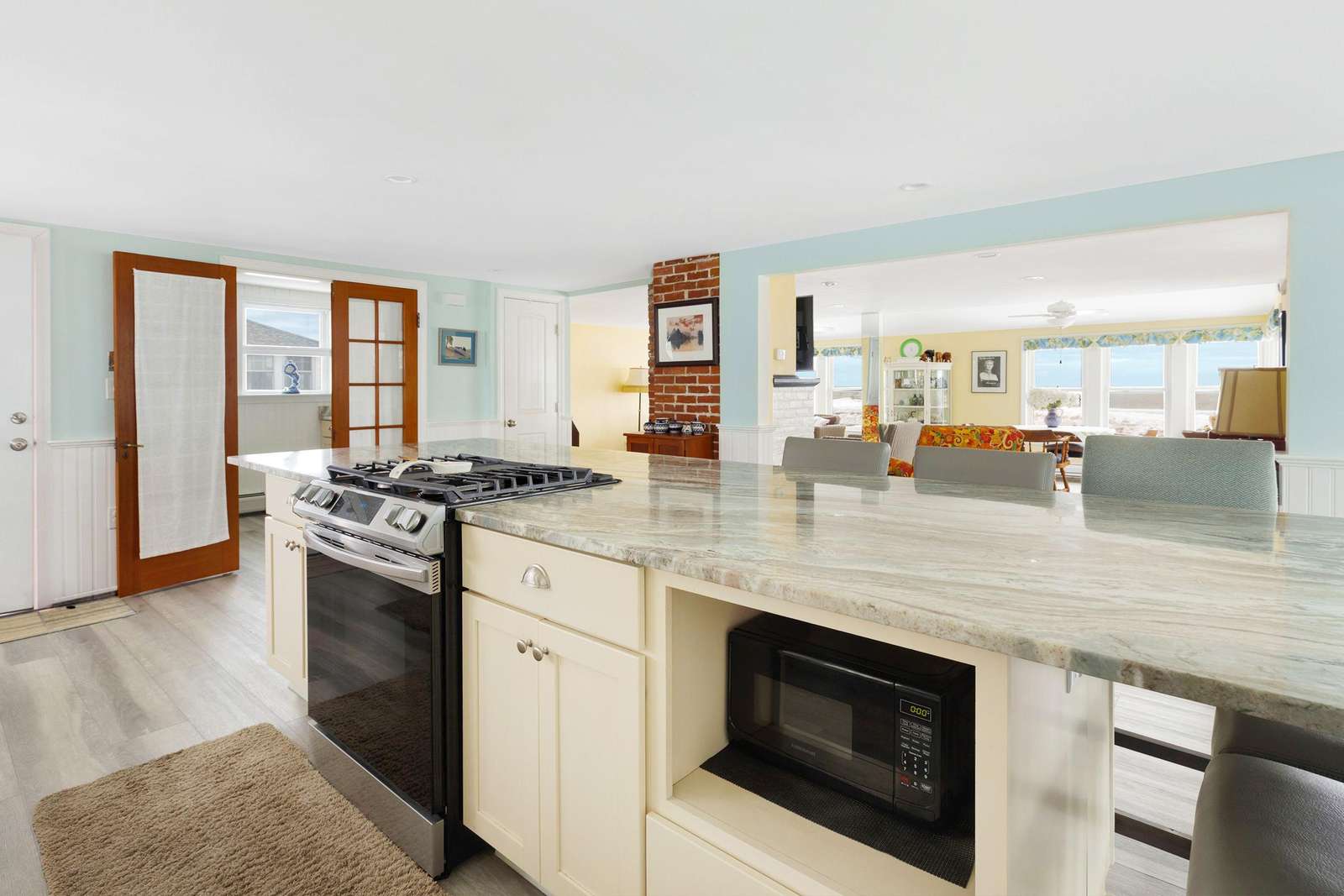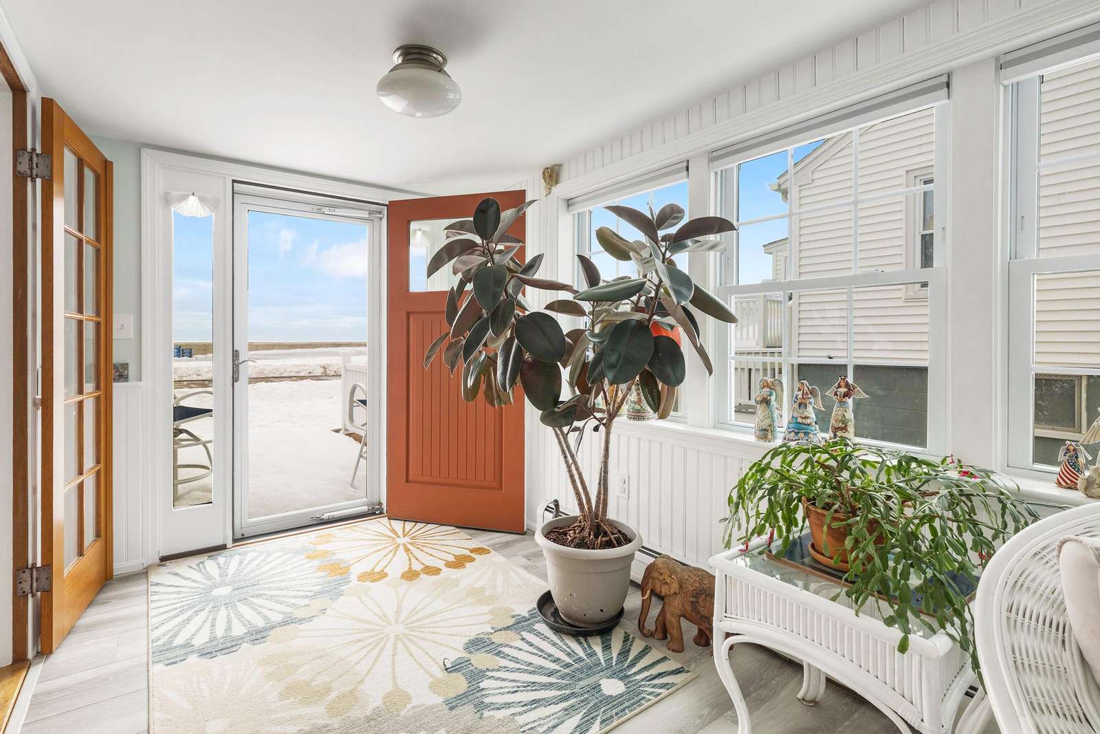 Experience the best of Hampton’s North Beach in this charming two-bedroom, 1.5-bath home situated on a prime corner lot. The moment you step inside, you are greeted by stunning ocean views through an abundance of windows that flood the open-concept first floor with natural light. The spacious kitchen is a chef's delight, featuring a full suite of stainless steel appliances, ample counter space, and a large breakfast bar island perfect for morning coffee. This level also provides a comfortable living and dining area, a television for entertainment, and a convenient half bath equipped with a washer and dryer. A window air conditioner keeps this main gathering space cool, while the large enclosed porch offers a perfect spot to relax.