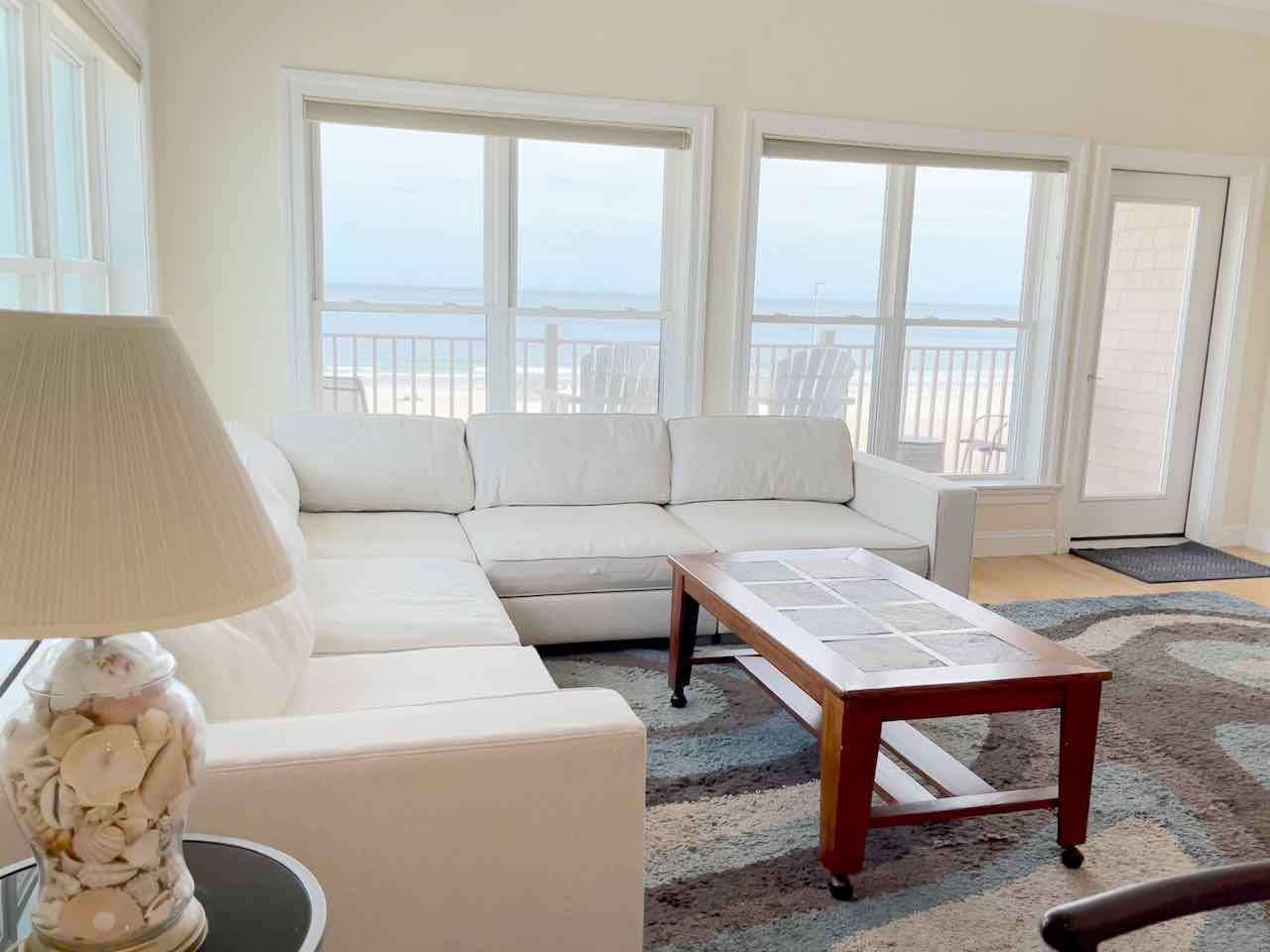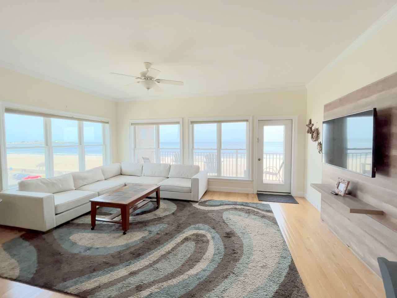 Wake up to discover stunning panoramic views of the Atlantic from this ocean front, fourth floor penthouse corner-unit condominium in beautiful Hampton Beach, New Hampshire. This 1200 sq’ bright and sunny unit features a private, un-abutted master wing with full en-suite bathroom, marsh views to the west, and a king sized bed. In the second bedroom, a queen-sized mattress with inviting town views to the north. Second full bathroom, soaring 10′ ceilings, and gleaming hardwood floors in an open concept floor plan make for a spacious, relaxing beach getaway.