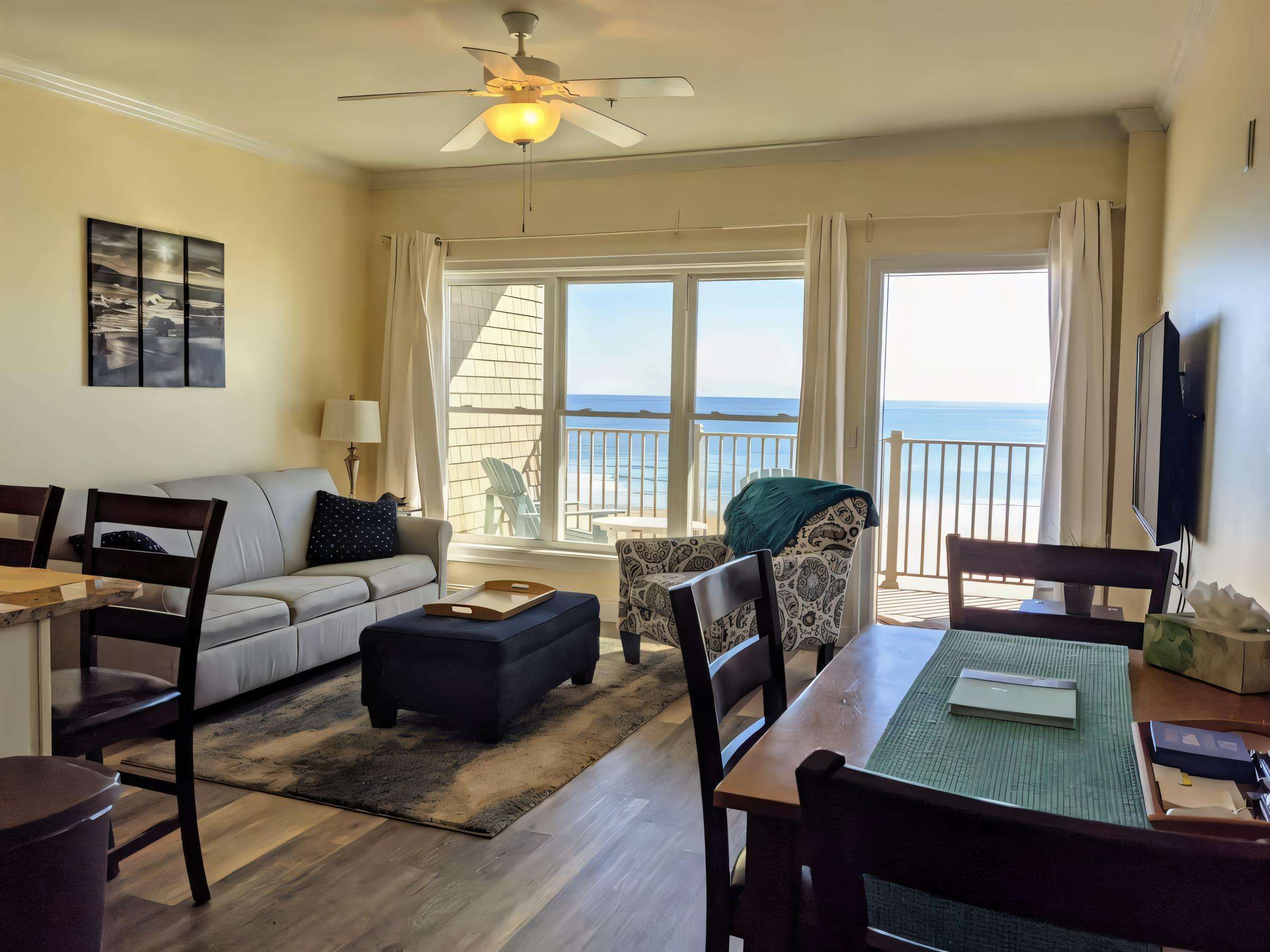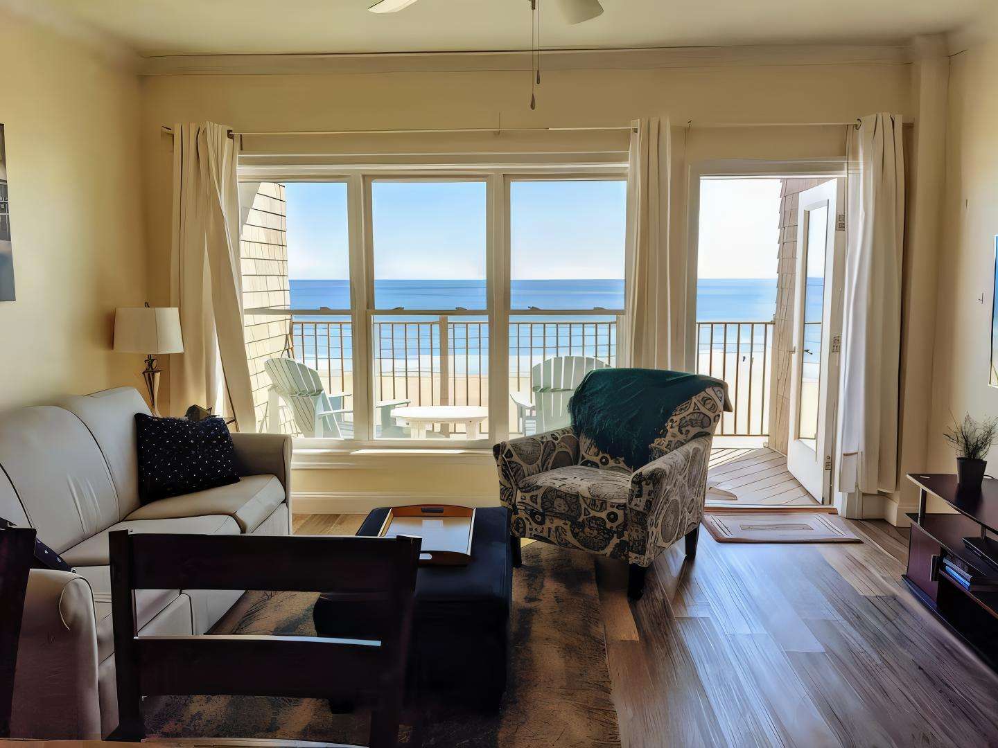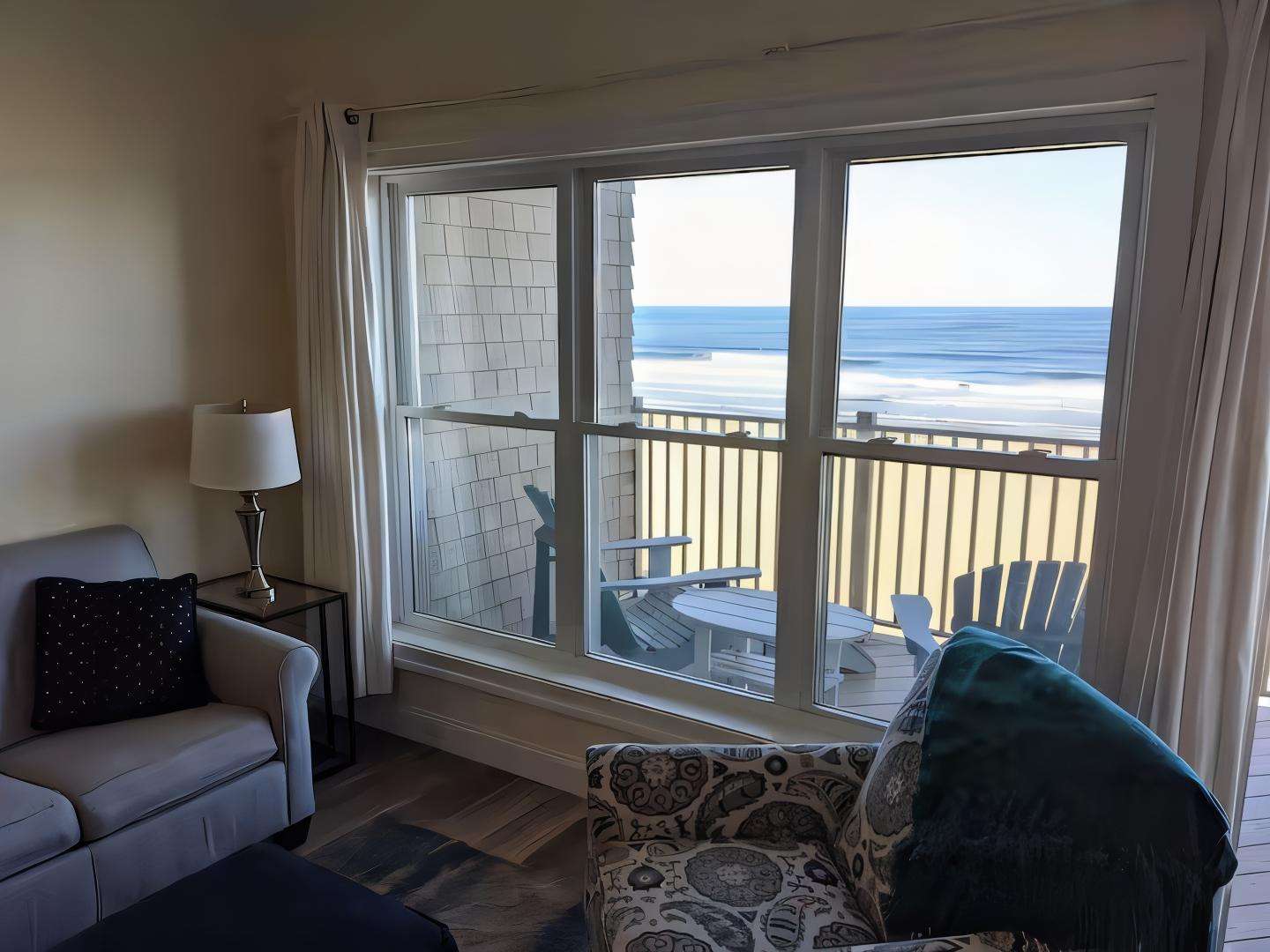 Experience coastal living at Surf Condos #504, a charming 1-bedroom, 1-bathroom oceanfront retreat in Hampton, New Hampshire. This condo offers stunning panoramic ocean views from a private balcony and deck, perfect for morning coffee or sunset relaxation. Inside, enjoy a bright, airy living space with air conditioning, a fully equipped kitchen featuring a dishwasher, and a cozy breakfast bar. The unit includes modern conveniences such as Wi-Fi, a washing machine, and dryer for your comfort. Just steps from the beach, you can soak up the sun, stroll the shore, or explore nearby local shops and dining. With one car parking included and allowing for up to four guests, this condo is ideal for a romantic getaway or a small family vacation. Elevator in the building for easy access to the 5th floor.